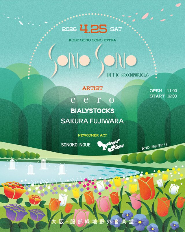 KOBE SONO SONO Extra SONO SONO in the greenpark ’26は、大阪・服部緑地野外音楽堂で開催される屋外1DAYイベントです。出演者としてcero、Bialystocks、藤原さくら、井上園子、Trooper Saluteが発表されています。